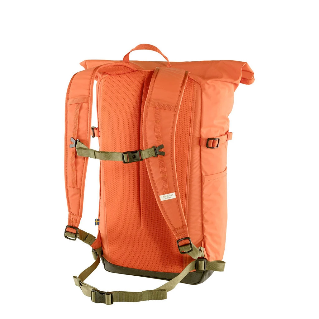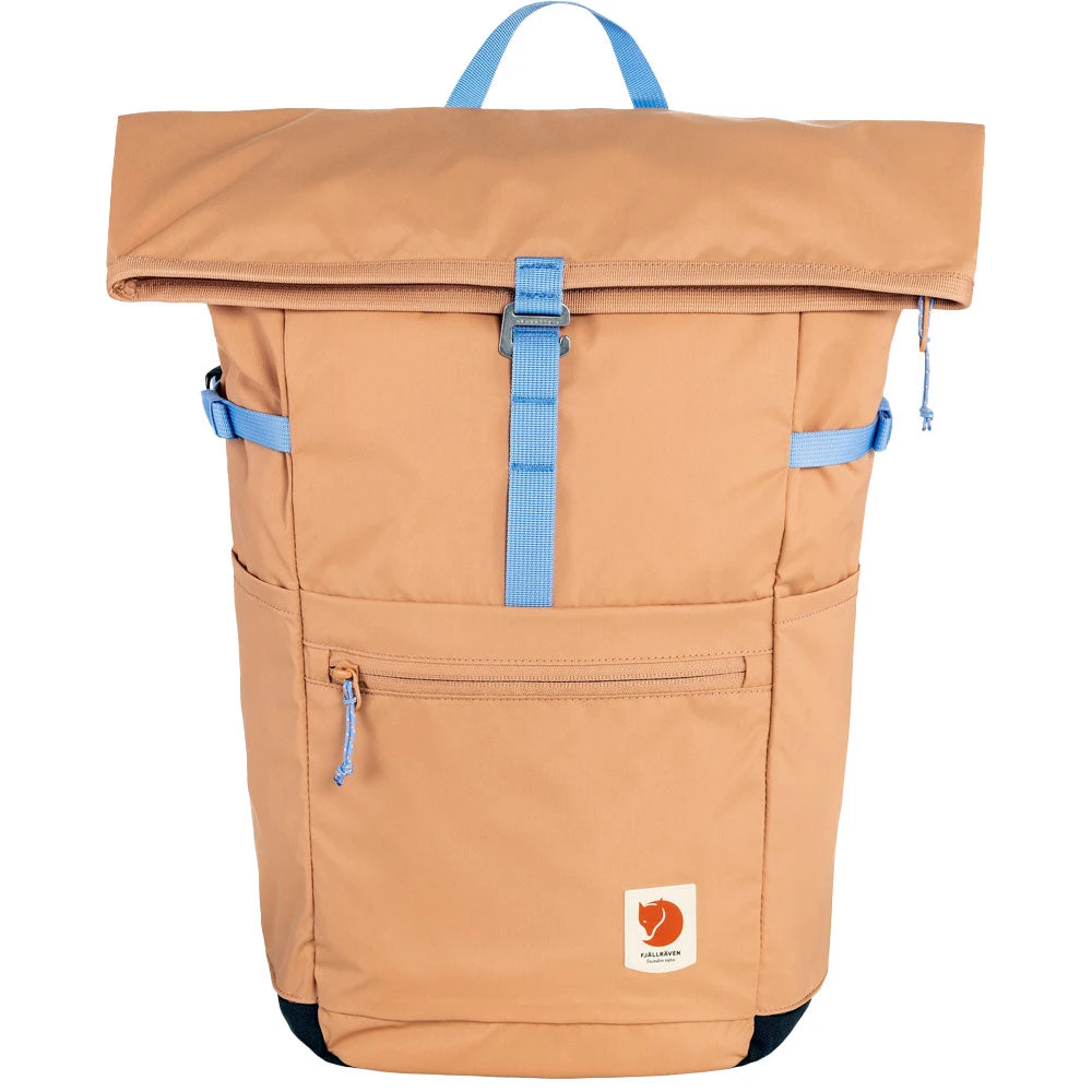 High Coast Foldsack har et hovedrom på 24 liter med tilgang via en horisontal glidelås i en brettetopp, som kan justeres etter mengden du pakker i sekken, ved å folde bretten ned og feste den tilhørende metallspennen til den passende festeløkken. På innsiden av hovedrommet finnet det et glatt stoft, en indre glidelåslomme ti verdisaker, og en åpen nettinglomme med stretch i baksiden som kan brukes som laptoplomme. En utvendig glidelåslomme i front passer fint til saker du ønsker rask tilgang til, åpne lommer på sidene passer perfekt til halvliters vannflasker, brusflasker eller termokopper. Det finnes i tillegg kompresjonsstrammere i oversidene som kan brukes til å sikre lengre flasker eller til ekstra sikring av innholdet i hovedrommet. Bunnen er forsterket med Fjellreven sitt Begshell-stoff, som gir en vannavstøtende og sikker bunn. Bæresystemet består av et ryggpanel i skum med pustende netting, to lett vatterte skulderstropper med brustreim, og et enkelt hoftebelte som hjelper med å stablilsere sekken når du bruker ryggsekkens fulle kapasitet. Hele sekken kan rulles sammen og festes med klipsen i front når den ikke er i bruk.