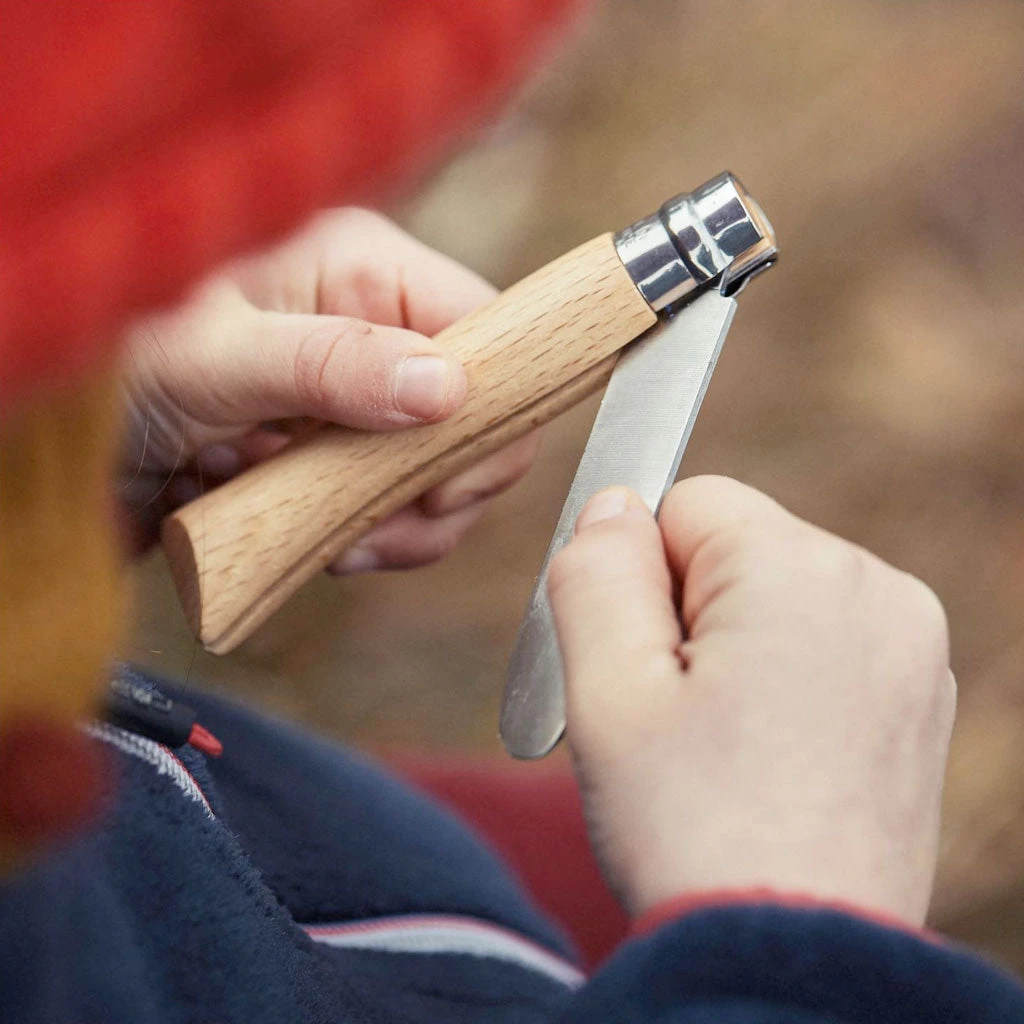 Denne lommekniven er laget spesielt med tanke på å kunne være barn og ungdom sin aller første turkniv, og er basert på den klassiske Opinel N°07 men med en butt spiss og medfølgende slire laget i resirkulert polyester!