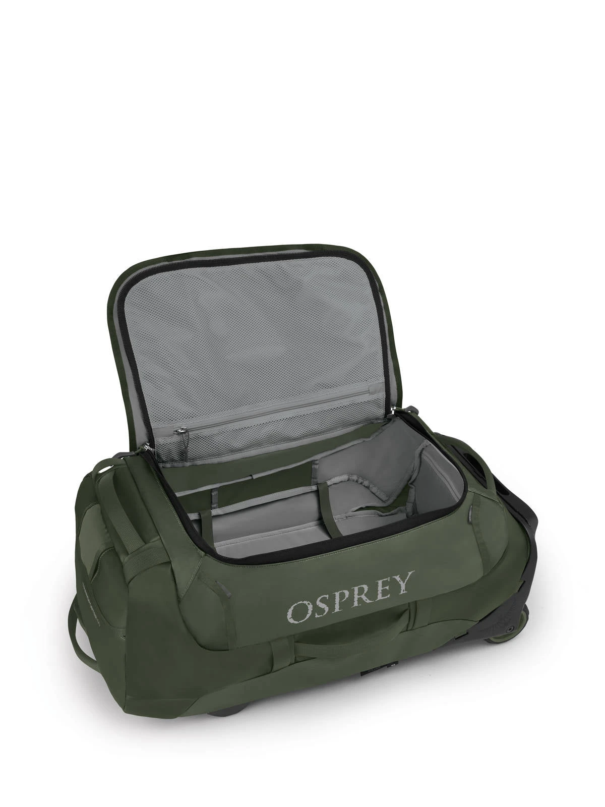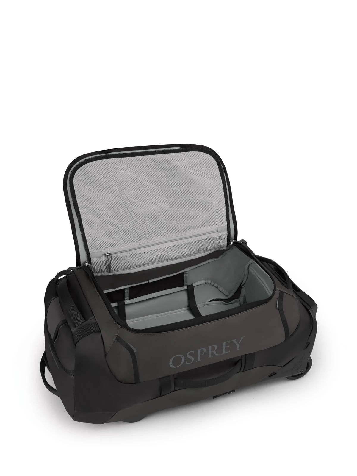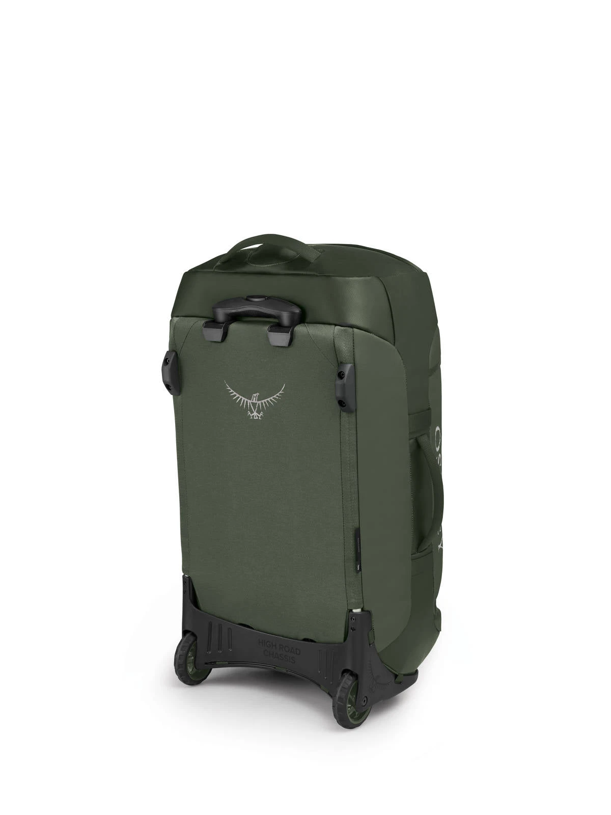 Summen av Ospreys HighRoad™ chassis, et komfortabelt ErgoGrip™-håndtak og TPU-laminert nylon i hoveddelen, gjør dette til en av de tøffeste trillebaggene på markedet. Hovedrommet er laget i kjent Osprey-stil, med en stor U-glidelås som åpnes opp lik som en koffert, der nettinglommer og kompressjonsstropper på innsiden bidrar til å sikre innholdet og gjøre organiseringen lett som en plett. Et topplokk rommer alt fra dokumentmapper og pass, til billetter og ID-kort.