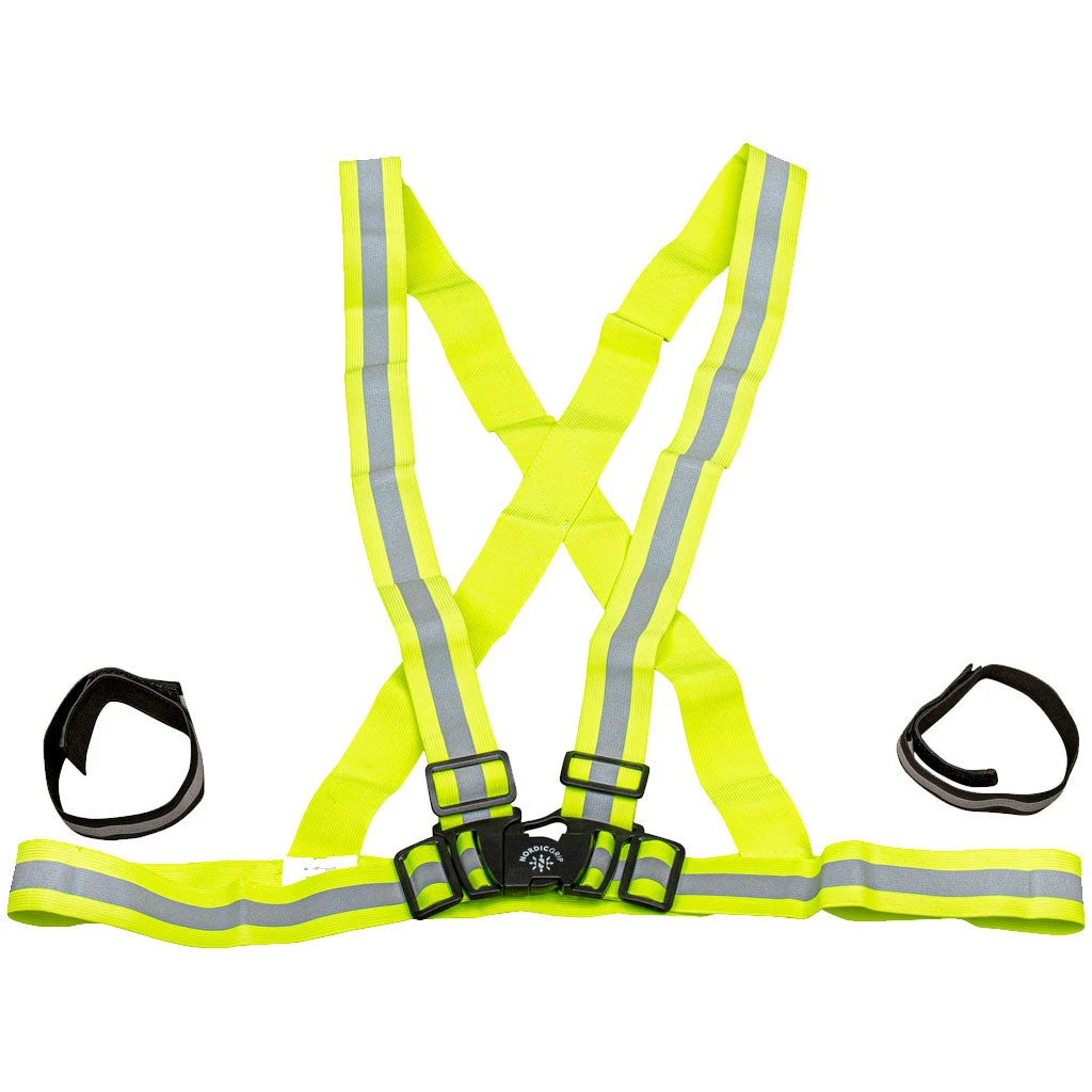Pakke med 1 x gul refleksvest og 2 x sorte refleksbånd i elastisk materiale med borrelåsfeste. Refleksvesten har en slank seleformet design med beltejusteringer i alle deler og en solid klips i front. Båndene brukes på armer eller ben for å bli synlig når man blir belyst i mørket. Spesielt nyttig på joggetur eller vandretur langs traffikerte veier i vinterhalvåret.